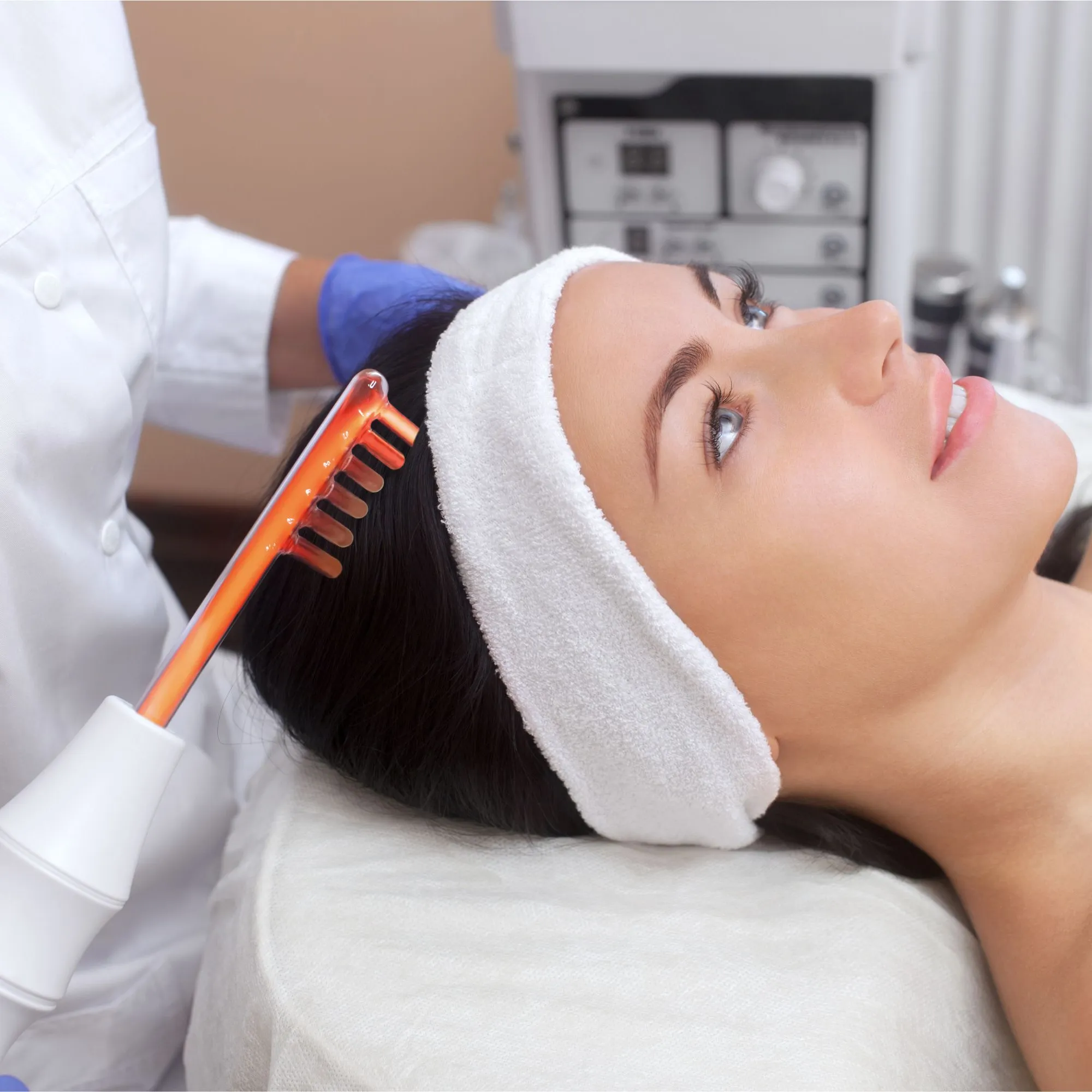 El masaje craneal con alta frecuencia es una técnica utilizada en estética capilar que combina estimulación manual del cuero cabelludo con el uso de un equipo de alta frecuencia (electroterapia suave).
